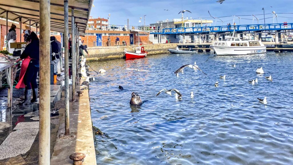 A cette heure matinale, les poissonniers sont en train de nettoyer les poissons et jettent les déchets dans la mer. Les lions de mer et les goélands trouvent une nourriture facile.