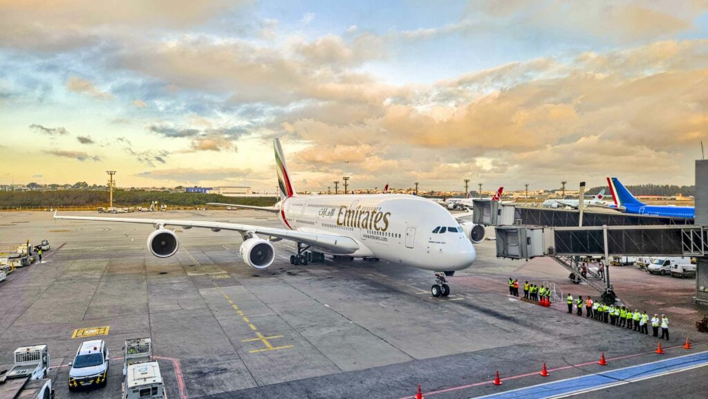 A Sao Paulo, nous patientons devant les pistes. Un Airbus A380 d’Emirates vient stationner. C’est un bel avion. Le personnel de piste fait une haie d’honneur.