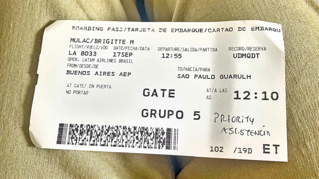 Sur le vol Buenos Aires – Sao Paulo, nous sommes classés en Prioritaires avec assistance, au vu de notre grand âge 😱, nous n’avons pas contesté car nous avons embarqué les premiers.