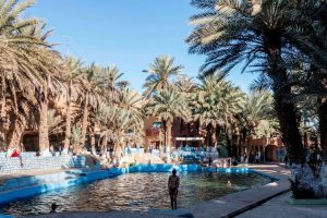 Arrivés à la source bleue de Meski, nous nous posons au camping du même nom, au milieu de la palmeraie. Cette source a été aménagée dans les années 1930 pour permettre aux légionnaires basés à Ar Rachidia de se baigner. Depuis, elle est devenue piscine municipale d’Ar Rachidia.