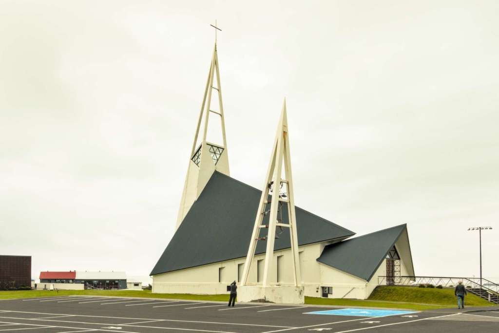 Vient ensuite Ólafsvik et son église blanche construite en 1967. L’architecte ayant voulu lui donner un aspect de morue. A l’intérieur nous sommes surpris par la couleur bleue, l’élévation du chœur et les vitraux évoquant des filets de pêche.