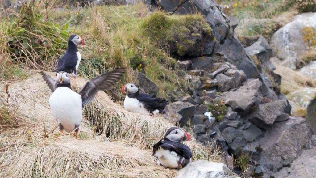 Sur les falaises que voyons nous ? Des Macareux. Chance ! C’est un des lieux privilégiés de ces oiseaux pour nicher. Mi août ils sont encore là !