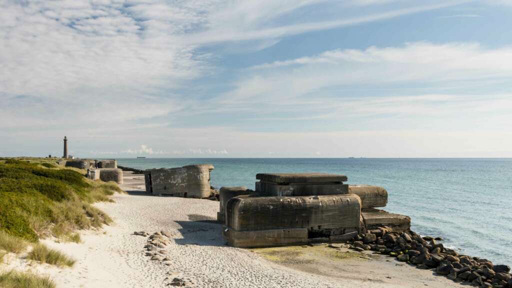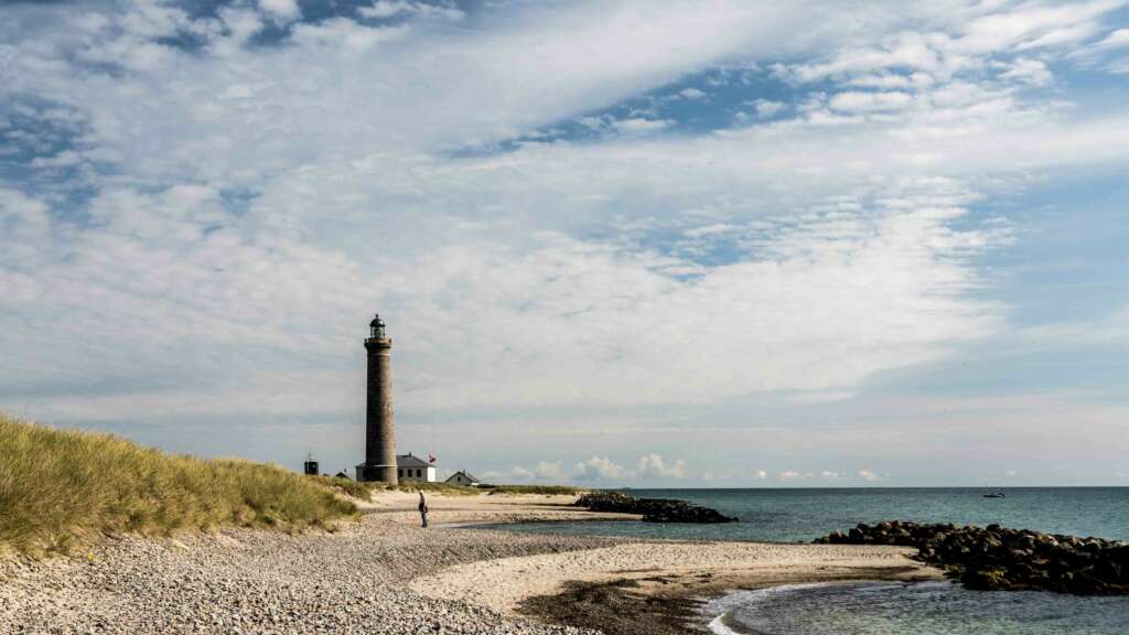 Près de là, nous découvrons le premier phare Vippefir un phare à bascule datant de 1626. À ses côtés le Hvidefir blanc de 1747 et vers Grenen celui de 1858 jouxtant un phare moderne tout noir.